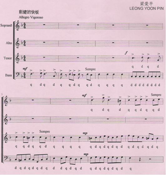 Leong’s choice of text shows a predilection for poetry ranging from the Chinese classical greats such as Li Bai (李白) and Du Fu (杜甫) to modern English nationalistic poetry by local poets such as Angeline Yap. His choice of texts is born of a natural affinity for the two languages and filtered by the political climate of the late 1950s – choral songs from China were banned and Leong’s compositions answered the need for choral repertoire that was free from political overtones.