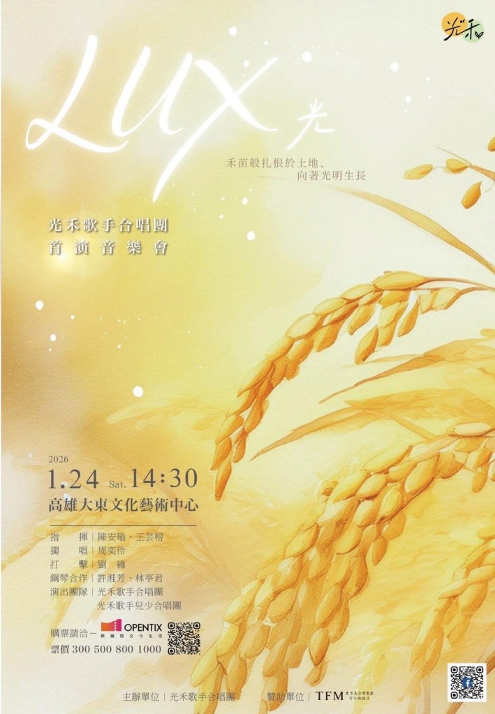 - 24 January 2026, Performance of 希望 “Hope,” 光禾歌手合唱團 Lux Singers, Conductor CHEN Anyu. 大東文化藝術中心 Dadong Arts Centre, Kaohsiung.